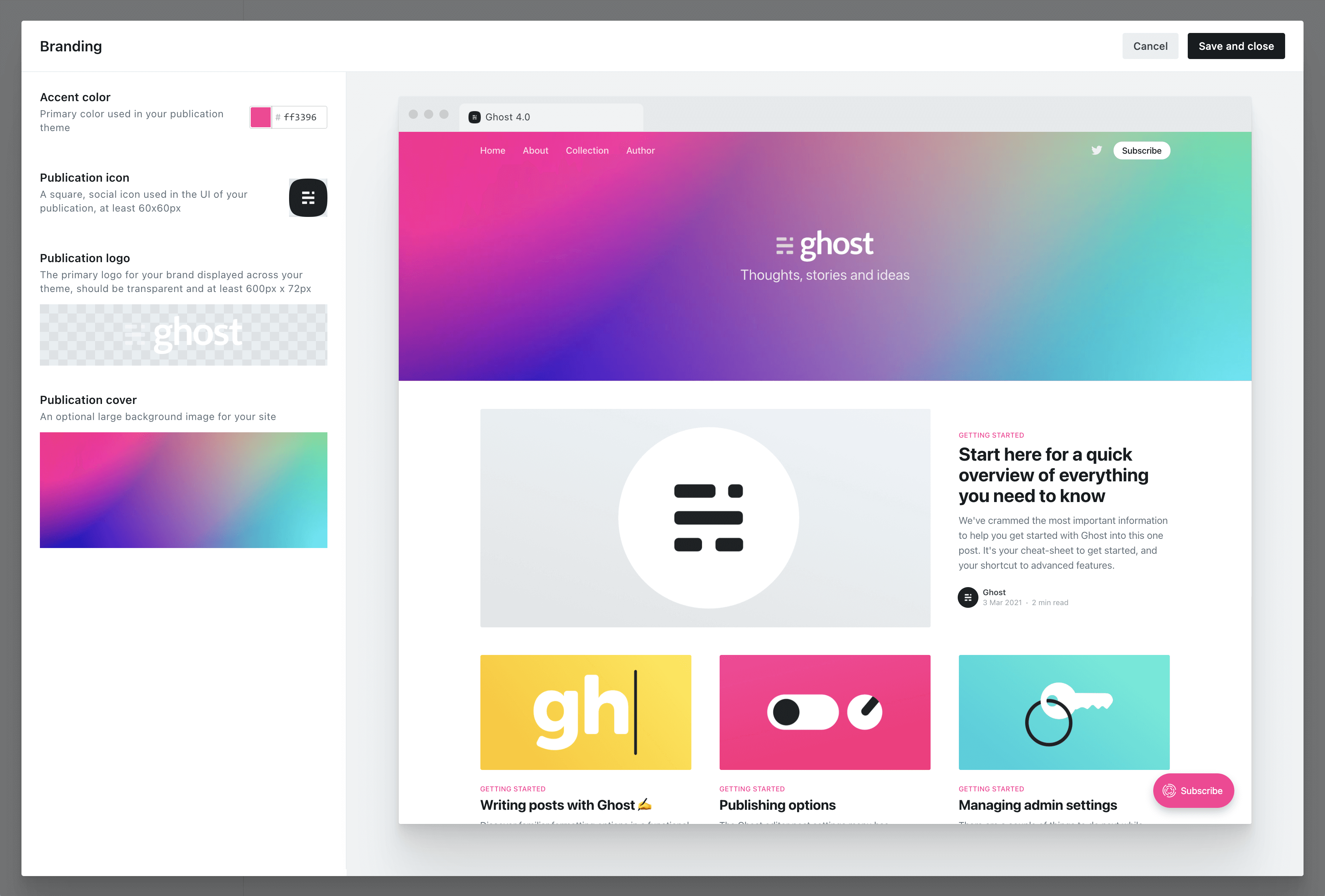 The best way to get started is with Ghost’s branding settings, where you can set up colors, images and logos to fit with your brand.